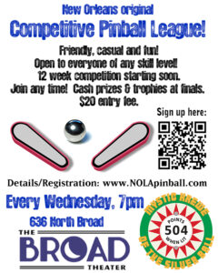 Our previous location on St. Claude was closed down due to Covid, but we’ve re-located, and we’re VERY excited about the new space for obvious reasons: It’s inside the famous BROAD THEATER! At 636 N Broad St, New Orleans, LA 70119 – This space is open daily from 2pm to 10pm (opening times vary depending upon movie schedules and may be open earlier/later) – you do not need movie tickets to come and play the games, and there’s food and drinks at the space – all ages welcome. To contact the Broad Theater, call +1 504-218-1008.